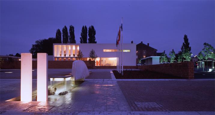 paroissiale autour d’un nouveau jardin clos. Le volume de la mairie, en apparence très fermé, opère un glissement par dessus le mur qui lui sert de soubassement, sans toutefois les relier,