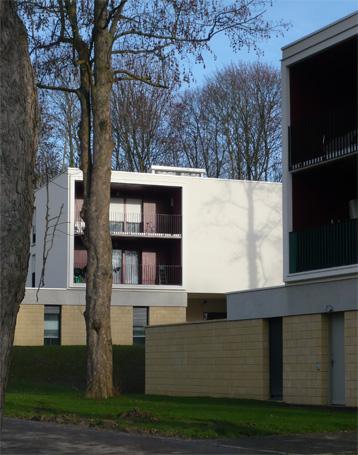 Les 5 volumes d’étages quel que soit leur position dans le site, s’ouvrent sur le Sud et l’Ouest par des larges loggias pour chaque logement. Blancs et abstraits, ces volumes sont réguliers; ils se retrouvent en suspension, alors que les rez de chaussée s’ancrent dans le terrain, en référence au fort de Bellecroix et à ses contreforts qui se prolongent sur le terrain. Ces rez de chaussée, plus étalés que les étages, sont traités de façon minérale avec une matière et une couleur qui rompent totalement avec les volumes des étages.